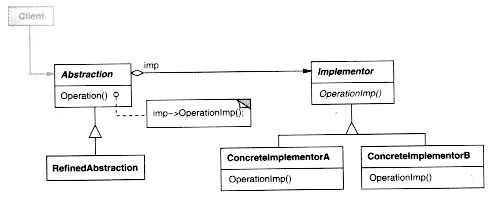 Window/IconWindow/Dialogtree with the PC/Mac/UNIX implementation bits removed, and an implementation tree which has an abstractImplementationclass and each concreteImplementationMac,ImplementationPC,ImplementationUNIXas subclasses. - The abstract tree then delegates to its implementation object for the low-level code.