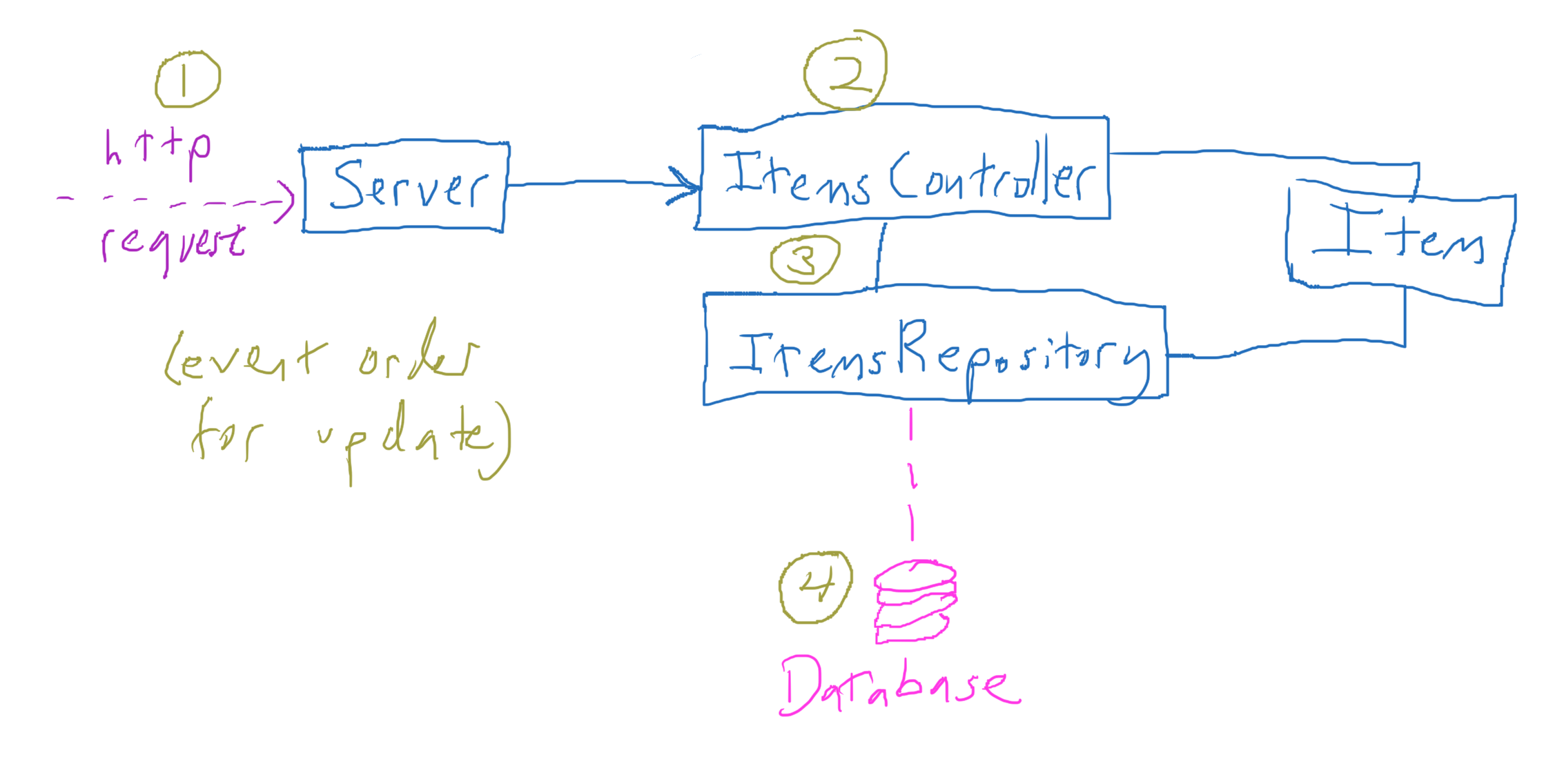 Observe the http routes/endpoints are insulated from the ItemXX classes, and how the database is insulated from all classes except for ItemsRepository: separation of concerns!